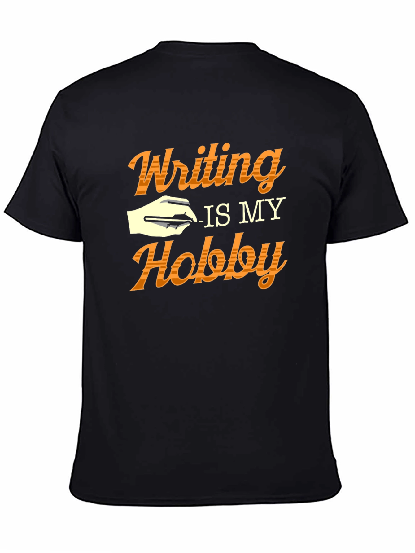 Express your passion for writing with this stylish black t-shirt. The design features the phrase "Writing IS MY Hobby" in a retro orange font, complete with a graphic of a hand holding a pen. Crafted from a comfortable, breathable fabric, this tee is perfect for casual wear. Whether you're brainstorming ideas, writing in your journal, or simply relaxing, this shirt lets you showcase your love for writing. It's also a great gift for writers, authors, and creative minds. Add a touch of inspiration to your wardrobe with this unique and eye-catching t-shirt.