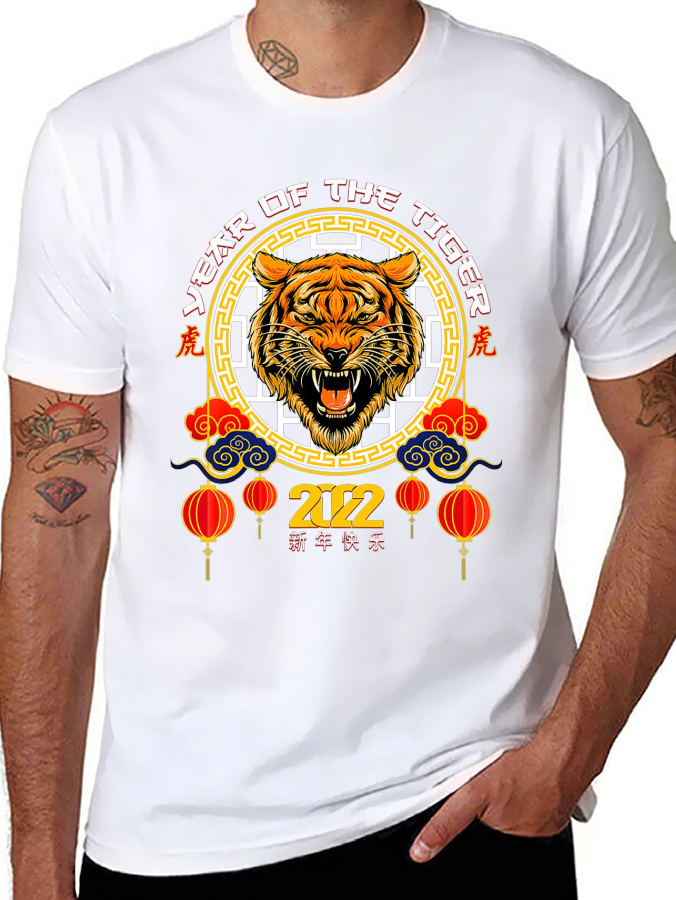 Celebrate the Year of the Tiger with this stylish black t-shirt. The design features a fierce tiger head encircled by traditional Chinese patterns and the words 'Year of the Tiger'. Red lanterns and auspicious clouds add to the festive spirit. The year '2022' is prominently displayed, making it a perfect commemorative item for the Chinese New Year. Made from comfortable fabric, this t-shirt is ideal for casual wear, festive gatherings, or as a unique gift for loved ones. Embrace the power and good fortune of the Tiger with this eye-catching tee.