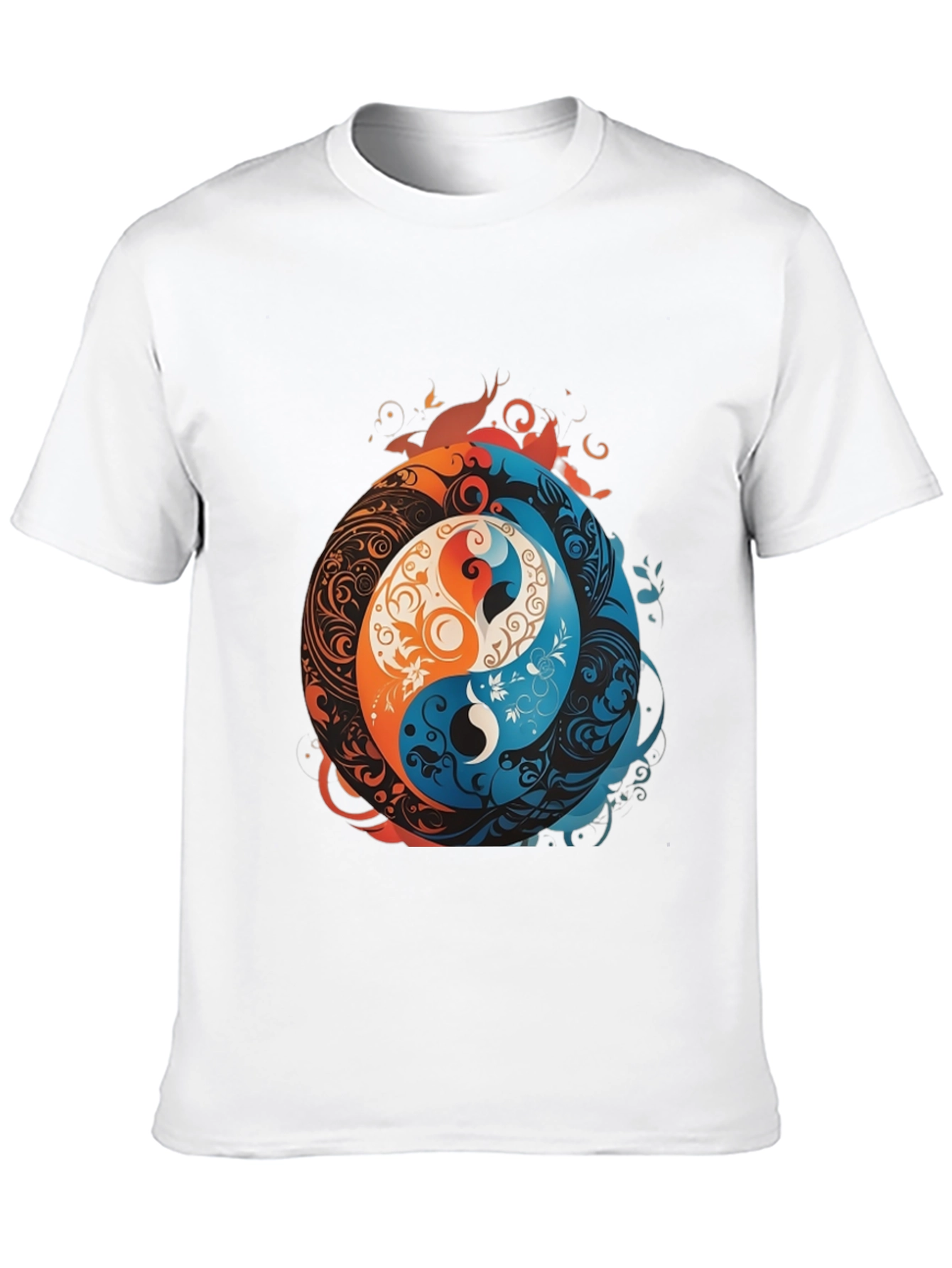 Embrace balance with this eye-catching Yin Yang graphic tee. Featuring a unique, artistic rendition of the iconic symbol, this shirt showcases intricate detailing in vibrant hues of orange and blue. The design is printed on a comfortable, classic fit black tee, making it a versatile addition to your wardrobe. Made from soft, breathable fabric, this shirt is perfect for everyday wear or casual outings. Express your inner peace and style with this unique and captivating graphic tee. A perfect gift for those who appreciate Eastern philosophy or unique designs.