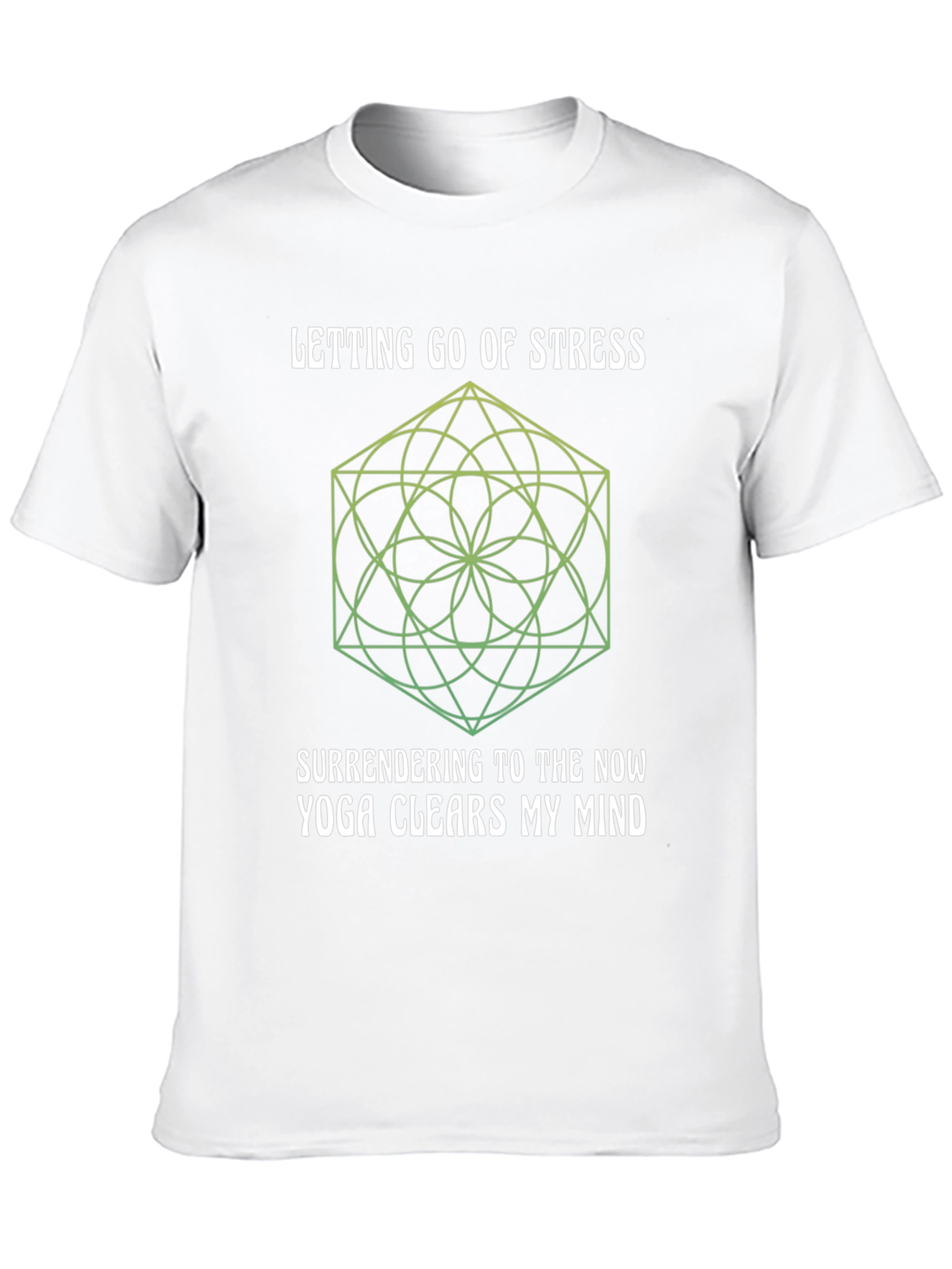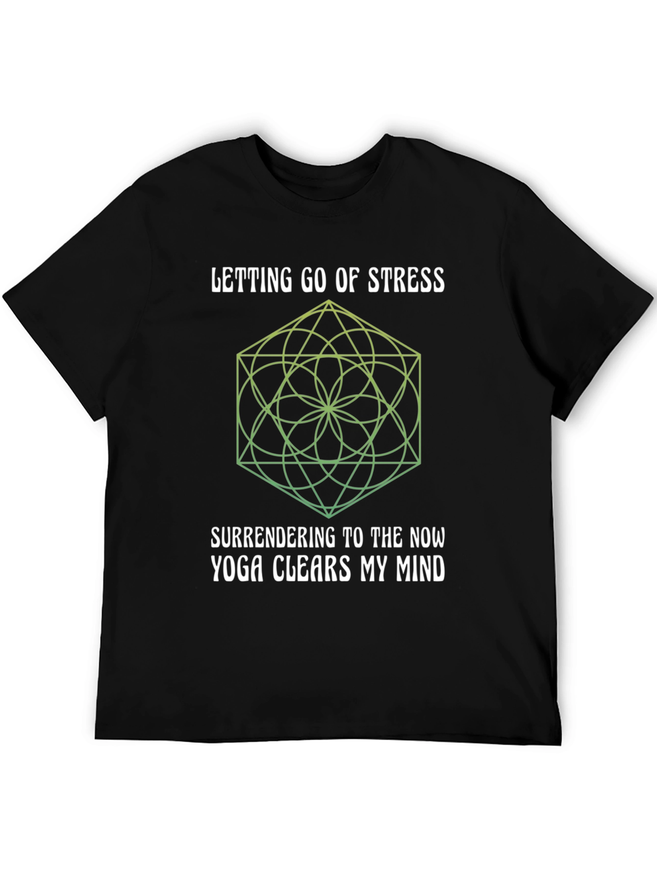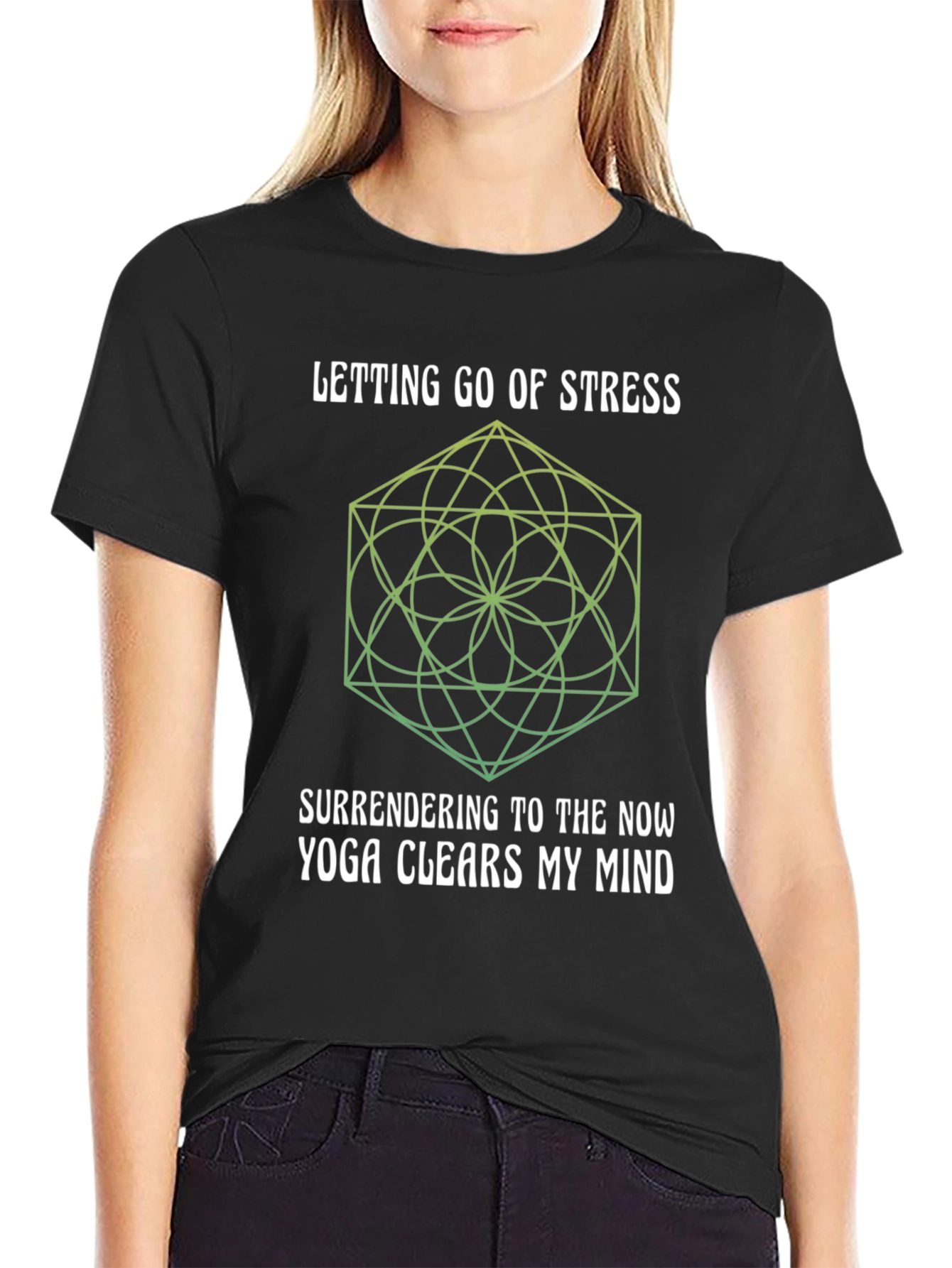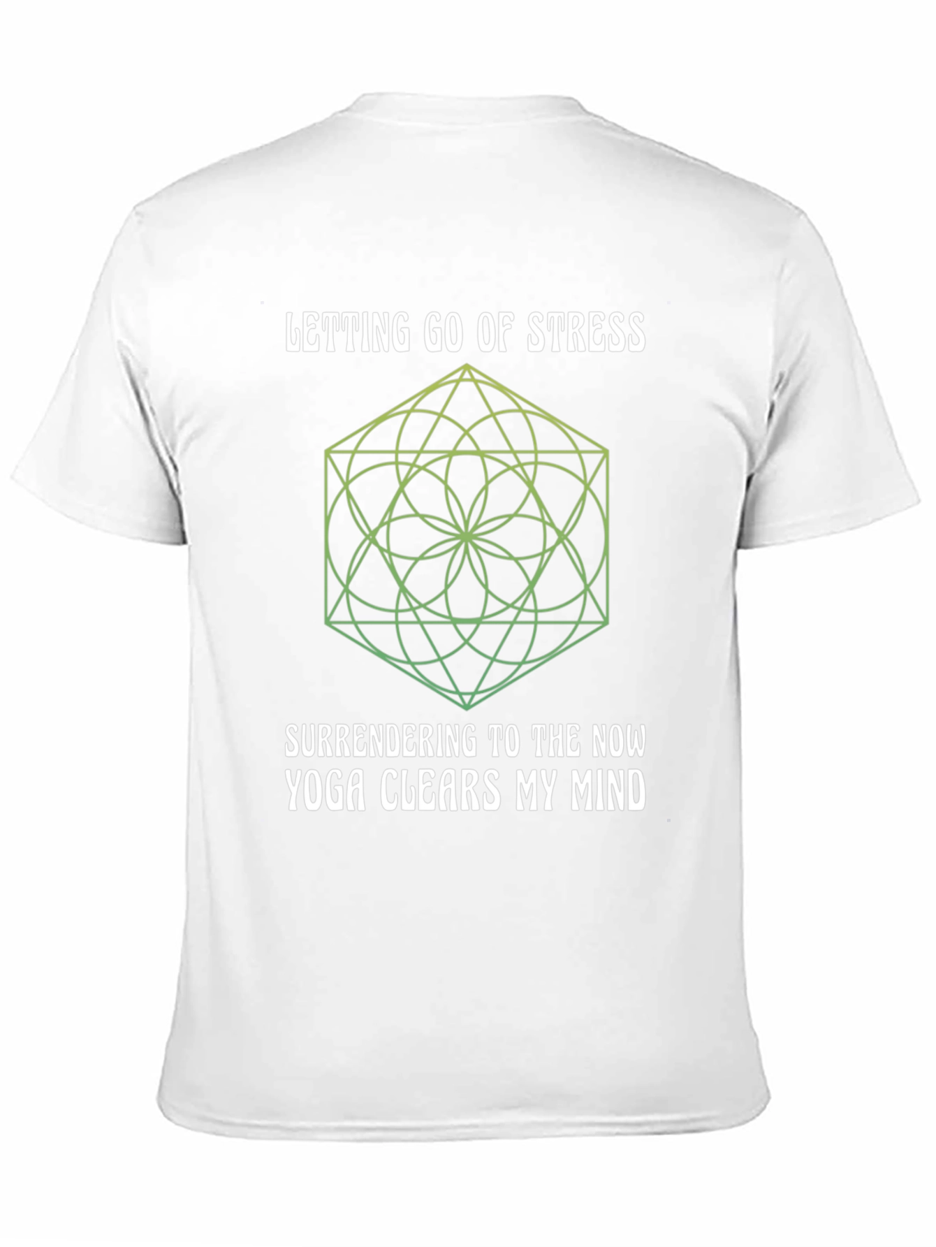 Embrace tranquility with this black t-shirt, featuring a geometric design that symbolizes balance and mindfulness. The shirt displays a message of stress relief and clarity through yoga. Made from soft, breathable fabric, this tee offers comfort for daily wear or yoga sessions. Its classic fit makes it a versatile addition to your wardrobe. Let the world know that Yoga Clears Your Mind. Perfect for those seeking inner peace and a stylish casual look.