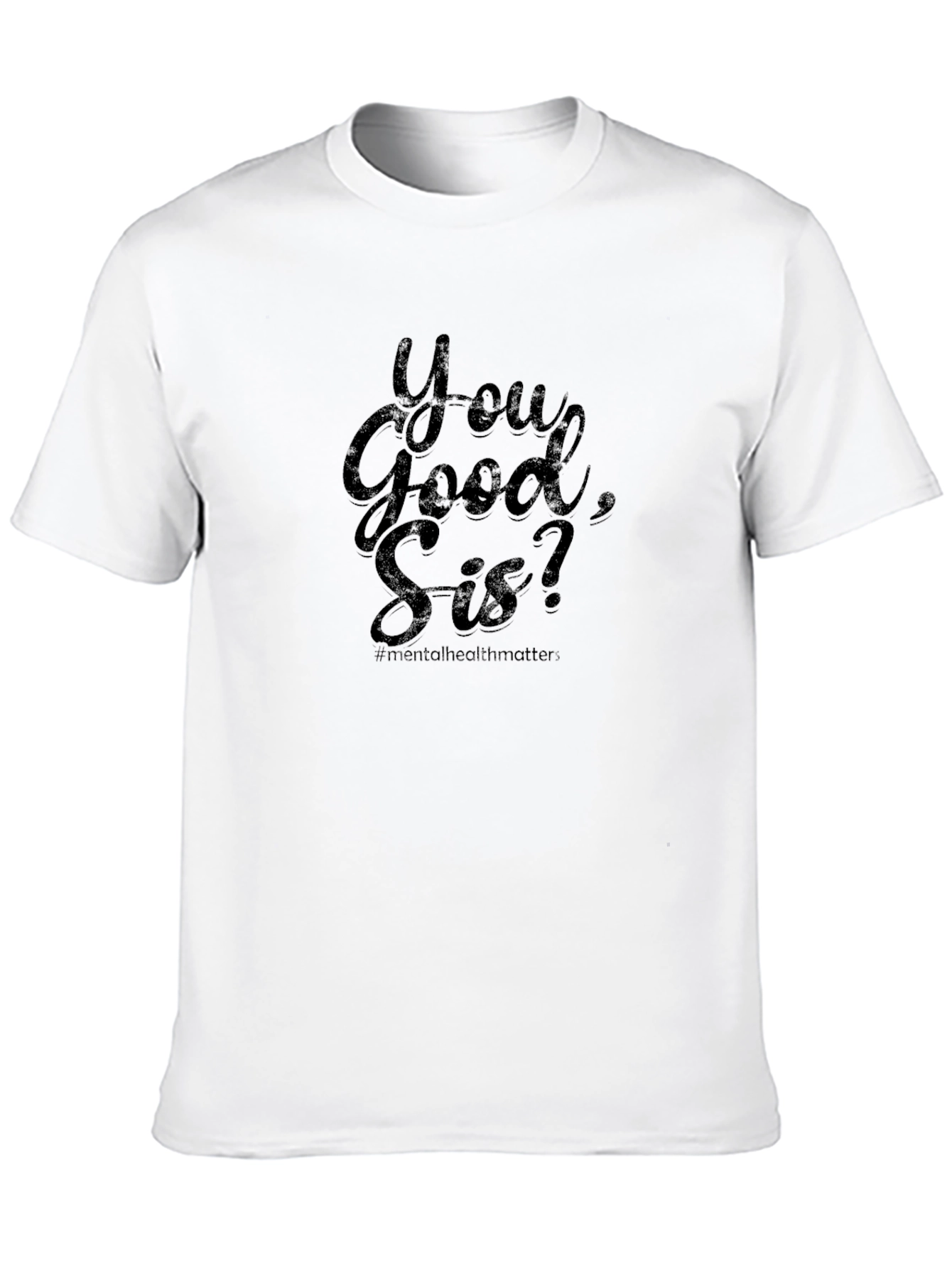 This classic black tee features the powerful message 'You Good, Sis?' underscored by '#mentalhealthmatter'. Made from what appears to be a soft and comfortable fabric, this short-sleeved shirt offers a casual yet meaningful way to support mental health awareness. Its versatile design makes it perfect for everyday wear, social gatherings, or advocacy events. Show your support and start conversations with this statement piece that combines comfort with a cause. The subtle design integrates seamlessly into any wardrobe, making it an easy way to promote an important message.