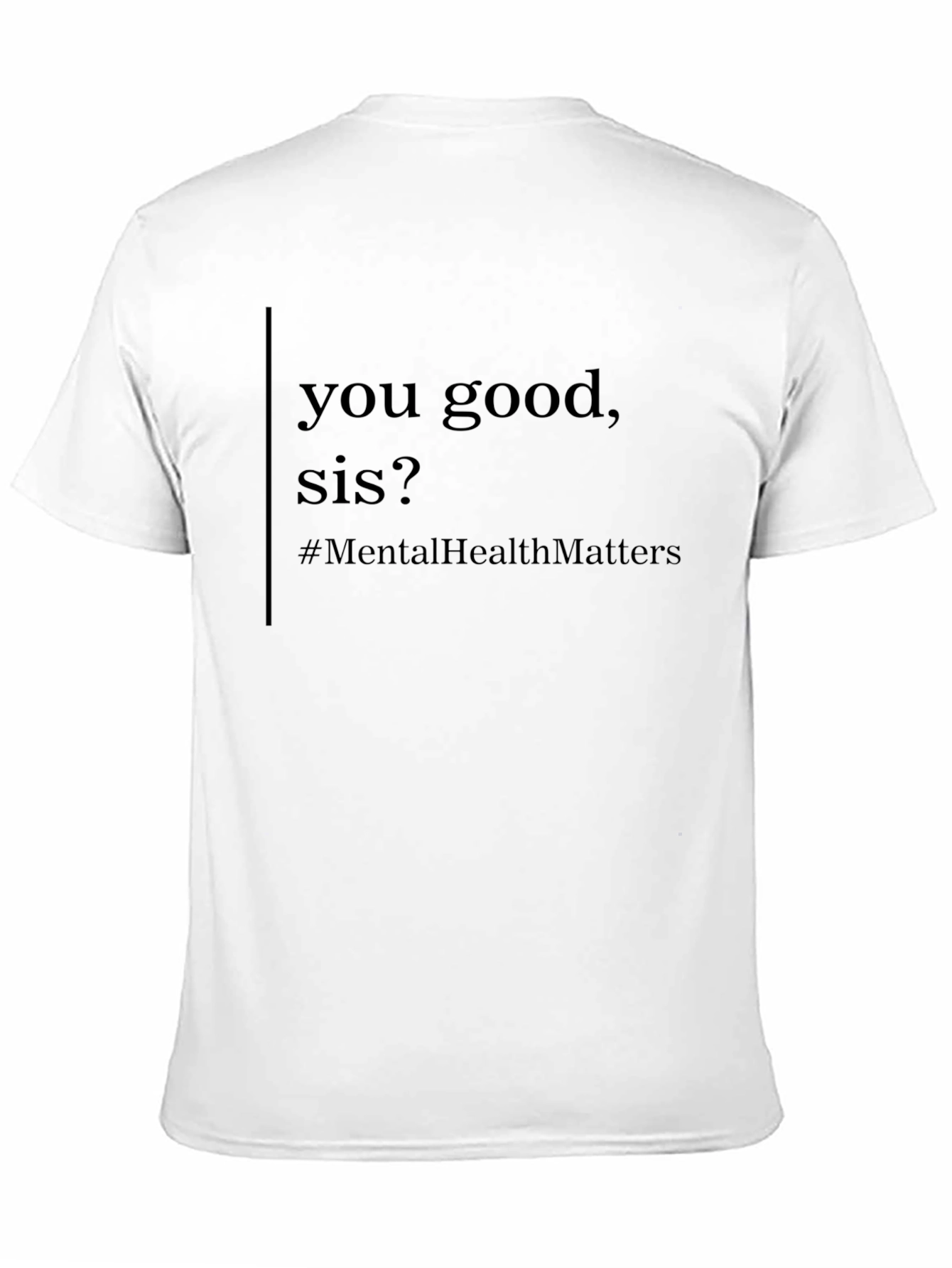 This classic black t-shirt makes a statement with the phrase 'you good, sis?' boldly printed on the chest, followed by '#MentalHealthMatters.' It's a simple yet powerful design that promotes mental health awareness and encourages open conversations. The shirt appears to be made of a soft, comfortable material, perfect for everyday wear. Wear this shirt to spark conversations, show your support for mental health initiatives, or simply as a reminder to check in on your loved ones. It is a meaningful way to make a statement.