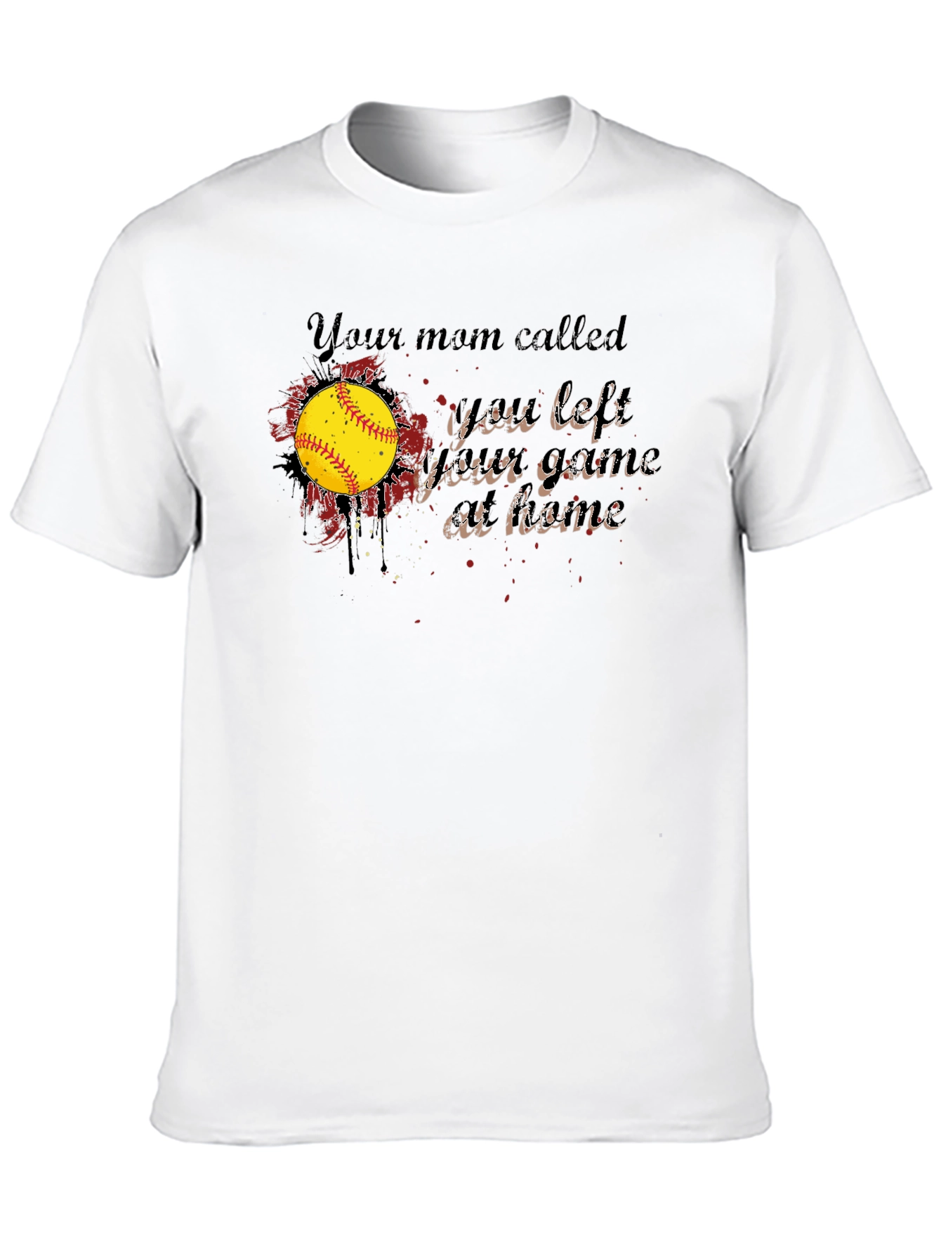 This black t-shirt features a graphic design with a playful message: "Your mom called, you left your game at home." The design includes a yellow softball with red splatter effects, giving it a cool, edgy look. Made from comfortable fabric, this shirt is perfect for casual wear. Show off your love for the game with this unique and humorous tee. It’s ideal for softball players, fans, or anyone who enjoys a fun and sporty style. This shirt makes a great gift and is sure to be a conversation starter. Perfect for everyday wear or sporting events.