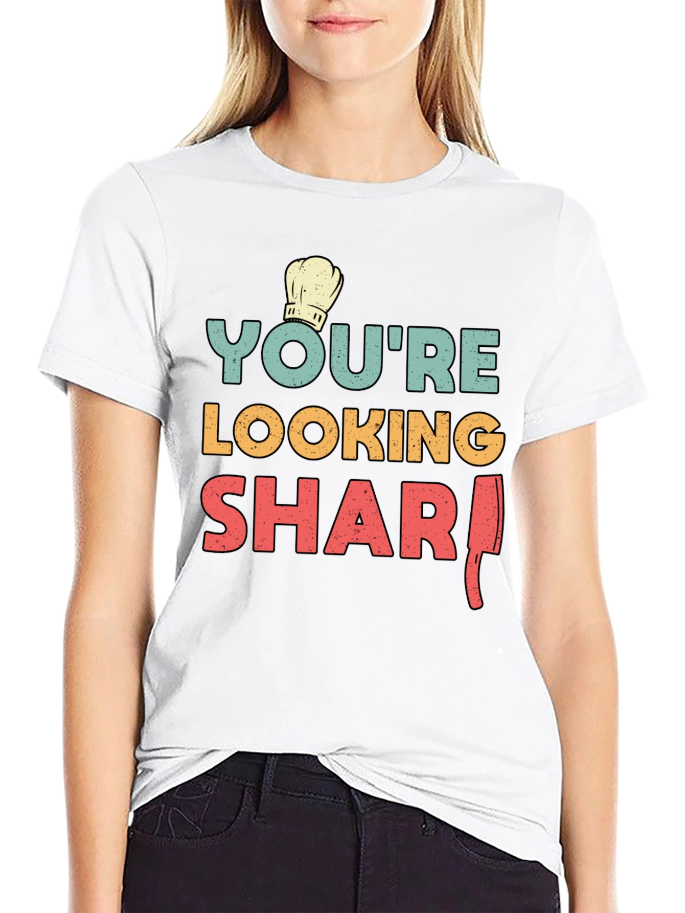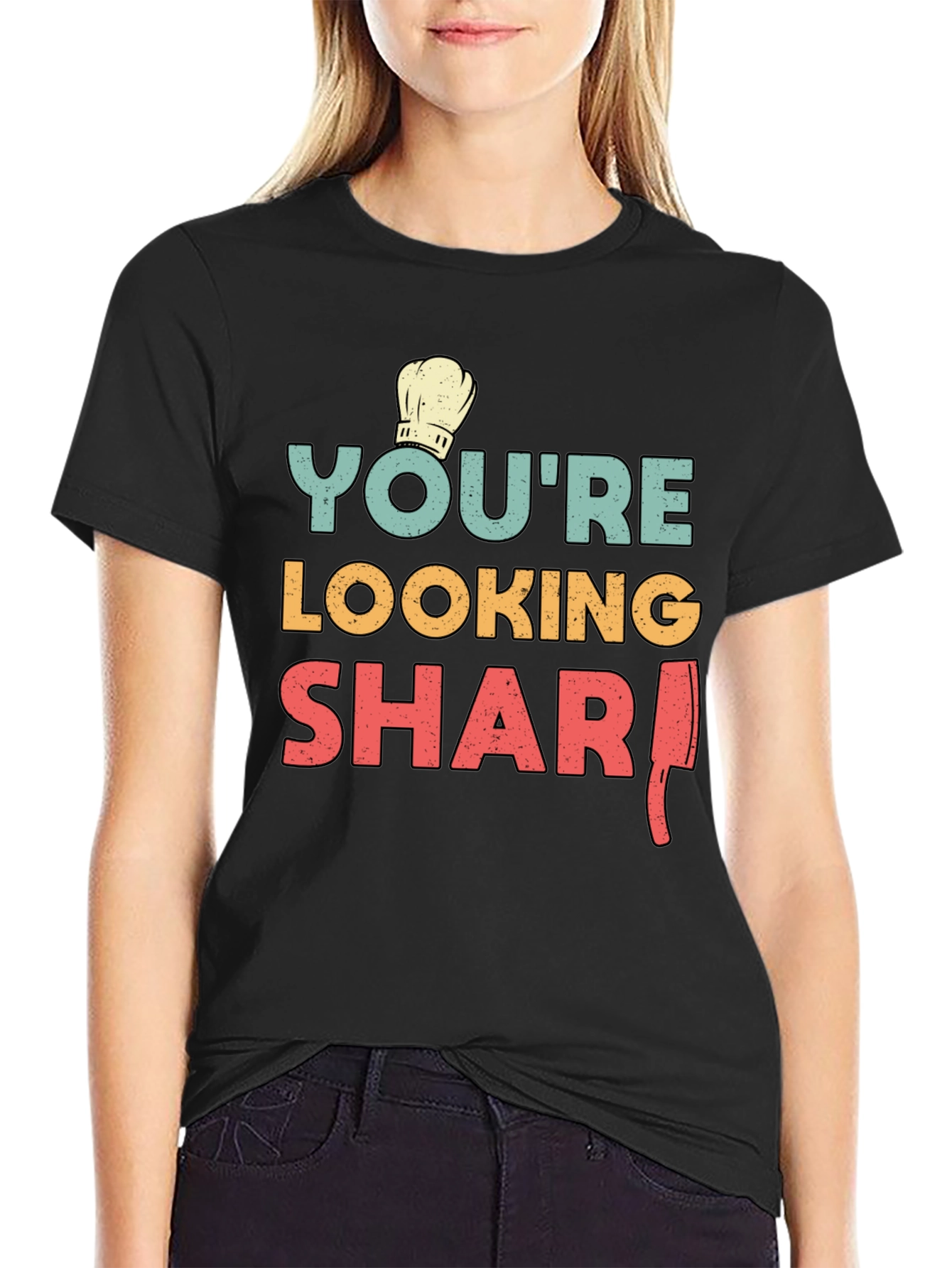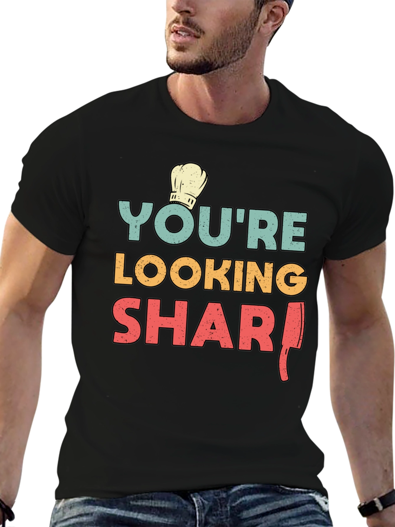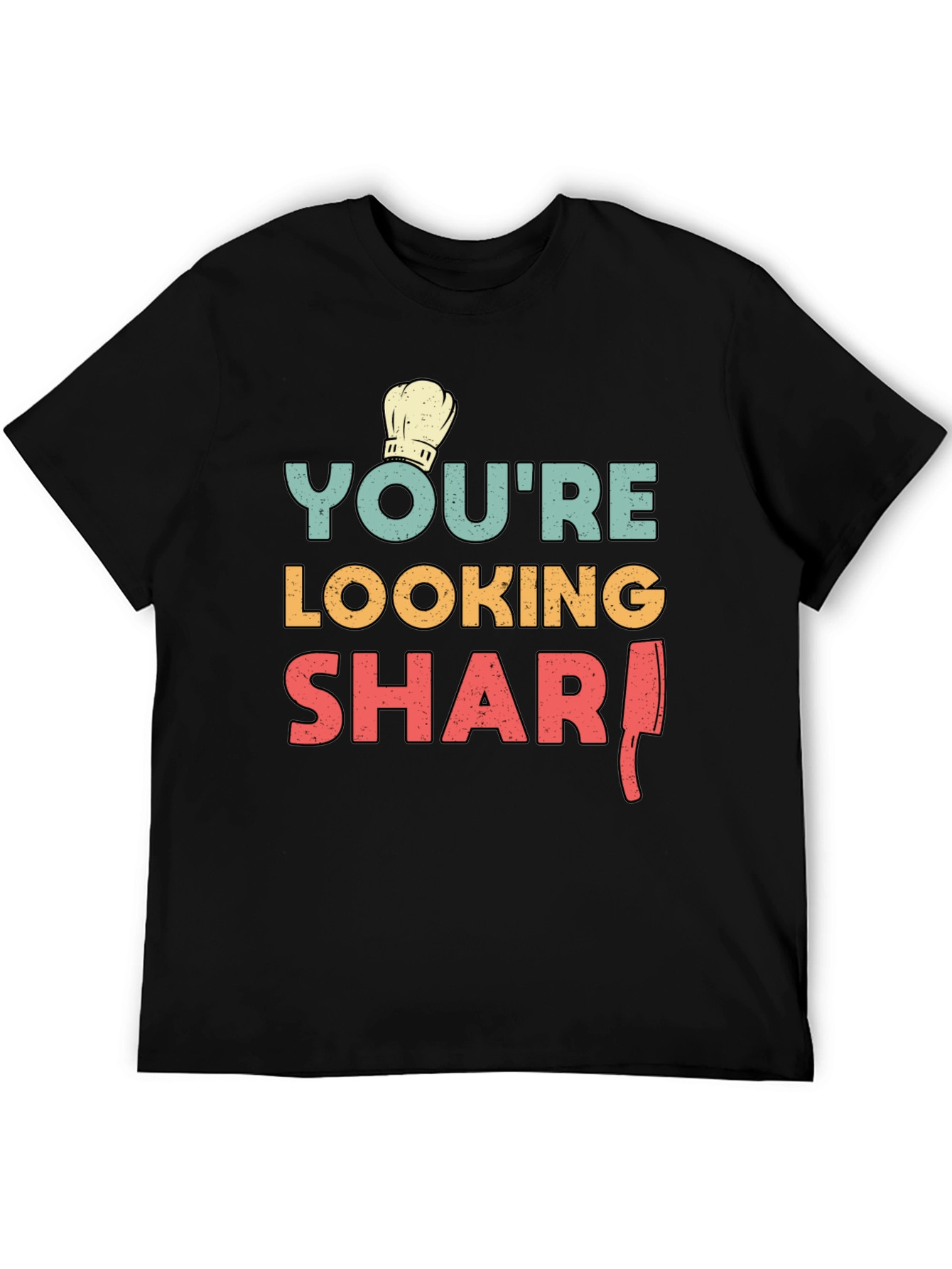 This black t-shirt features a fun and stylish design for culinary enthusiasts. The print reads "You're Looking Sharp" in vibrant teal, yellow, and red, complemented by a classic chef's hat icon. A clever illustration replaces the "P" in "Sharp" with a butcher knife, adding a playful twist. Made from a comfortable-looking fabric, this tee is perfect for casual wear, cooking events, or as a gift for the chef in your life. Show off your culinary flair with this unique and eye-catching t-shirt.